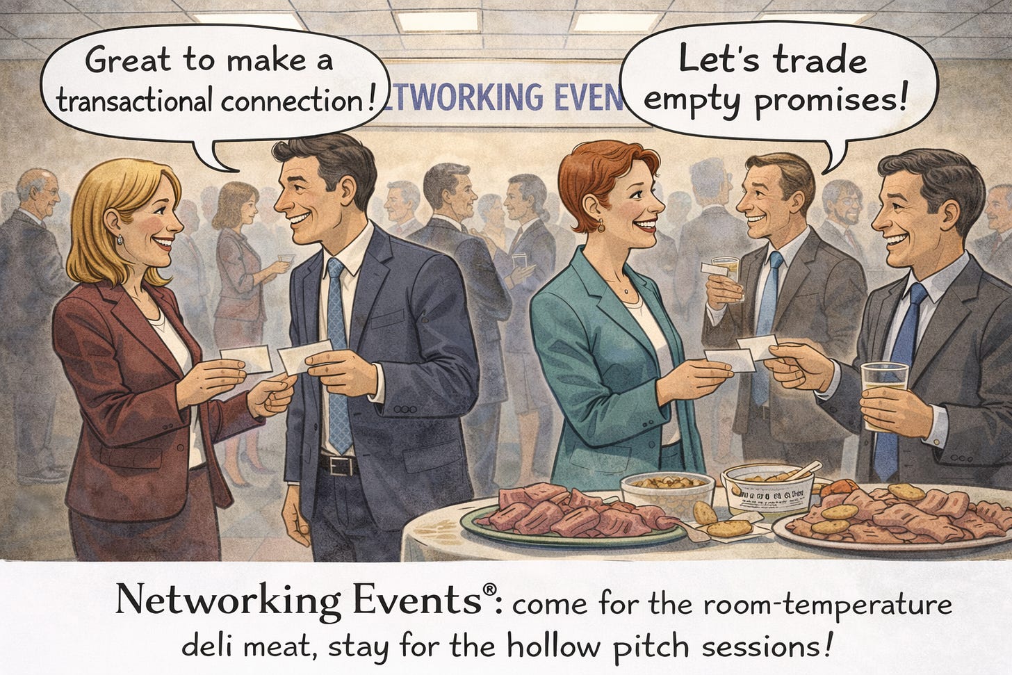 They claim to be about connection. But most are about lead generation and status sorting. They are marketplaces disguised as community. People show up with smiles that don’t reach their eyes, trading business cards like Pokemon. If the real purpose is “I want business,” say that. If the real purpose is “I want belonging,” then for the love of God, stop making everyone pitch themselves in fluorescent lighting next to a table full of stale hummus and room temperature deli meat.