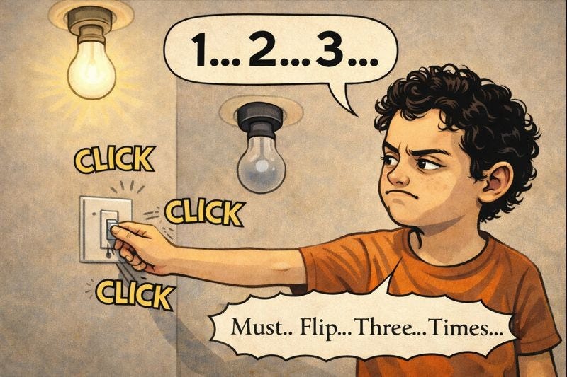 I need you to understand something, though. It is imperative that light-switches are flipped 3 times. Every time and any time they need to be flipped. Yes, always. To be clear, this means that to switch a binary light from off to on, you have to flip it from off to on, from on to off, and then, again from off to on, just so.