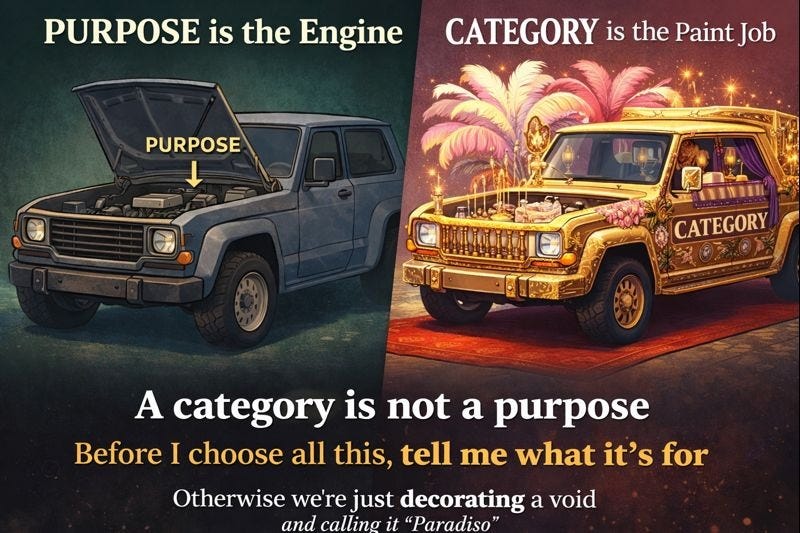 This is what I mean when I say a category is not a purpose. The form is a costume. The purpose is the function, the mechanism of change. And when the purpose is misnamed, or hidden, or lied about, the participants feel it. They don’t always know why they feel it, but they know they’re being used by a container that won’t name itself.