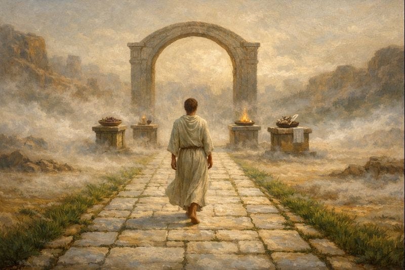 An archway resolves from an indistinct horizon, and, outside of time, there are no minutes, only steps that you have already taken, as you stretch towards it and come to a meaningful rest. Beyond the archway are four altars. There are no walls, just one archway and four altars with offering plates set in them. Though it seems obvious that you should be able to step around them. You know that you can not. There are only these four altars and the paths that lay beyond them.