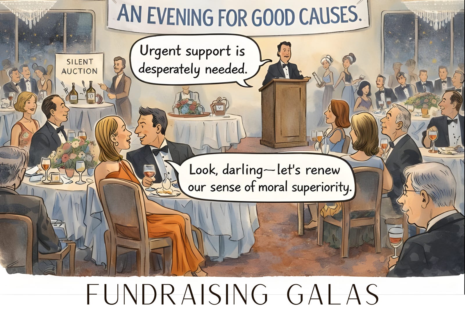 They claim to be about raising money for the mission. But more often than not, they are about status maintenance, donor theater, and social proof. The “fundraising” is frequently a loss leader, a glossy container designed to lubricate future giving, renew identity as a “good person,” and keep the right people in orbit. None of that is inherently bad. It’s just not honest when the invitation reads like an urgent moral appeal and the actual function is a fancy dinner party with a tax deduction and a silent auction for rich people to cosplay philanthropy.