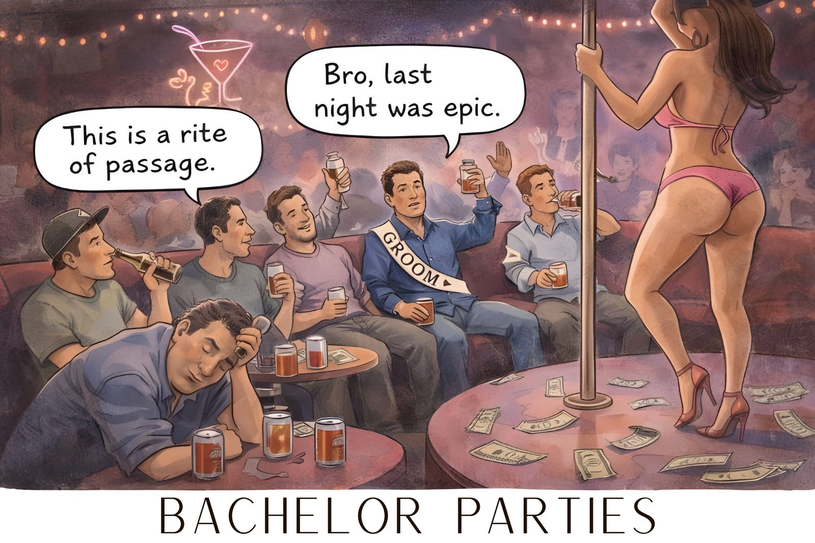 They claim to be a rite of passage. A sendoff. A threshold. But most are not designed as initiation, they’re designed as sanctioned dissociation. An excuse to externalize fear, grief, and ambiguity as excess. If the real purpose is “let’s celebrate our friend and bless his transition into partnership,” the structure should build that. Instead we often get a culturally approved pressure valve for unspoken dread, and then everyone pretends the hangover was the point.